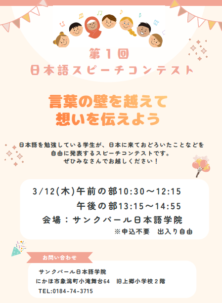 3月12日(木)に、学生による日本語のスピーチコンテストを行います。 日本の生活で感じたこと、文化の違いなどについて学生が自由に発表をします。 市民のみなさまも、ぜひお越しください。 1.日時 :3月12日(木) 【午前の部】 10:30~12:15 【午後の部】 13:15~14:55 2.会場 :サンクパール日本語学院 ※事前の申し込み不要・出入り自由です 投稿ナビゲーション 秋学期入学式